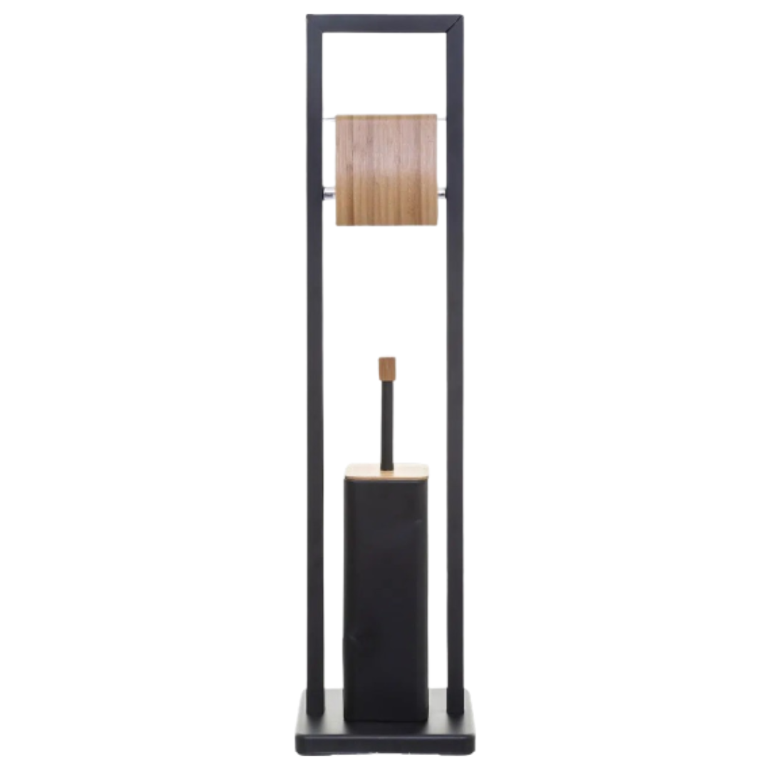 Classic black toilet paper holder with container for toilet brush. Practical, but also decorative. Made of a combination of bamboo and metal. Dimensions: 20x20x60 cm.