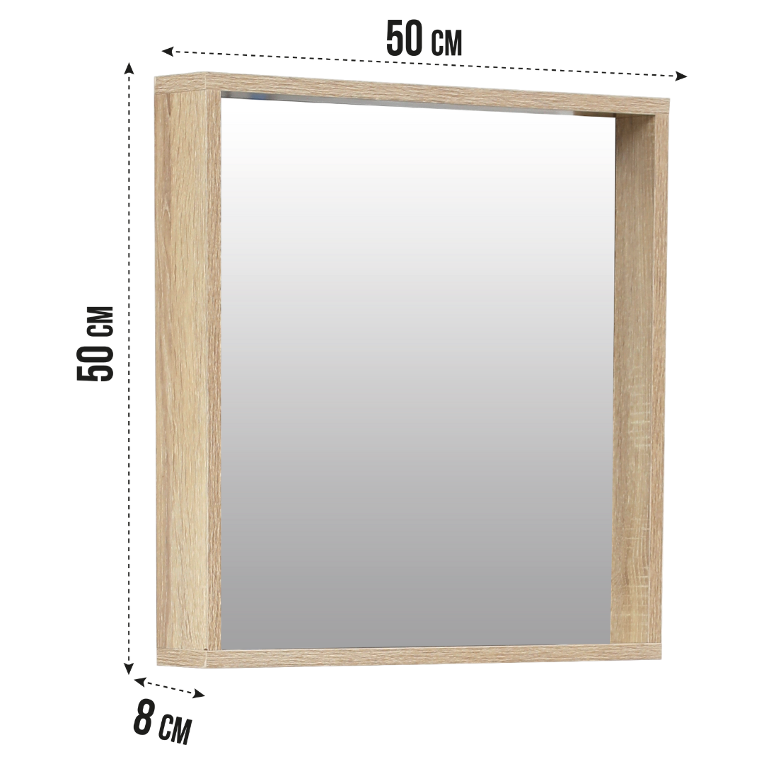 A bathroom mirror with a frame, with simple lines, will complete any space where soothing and natural elements and tones prevail. The lower part of the mirror frame can be used as a shelf for storing smaller items. Enjoy the simplicity of this mirror and the beauty of everything that surrounds you. Color: wood color; Material: Natural wood and glass; Dimensions: 50x8x50cm; Maintenance: wipe with a damp cloth and a non-invasive cleaning agent