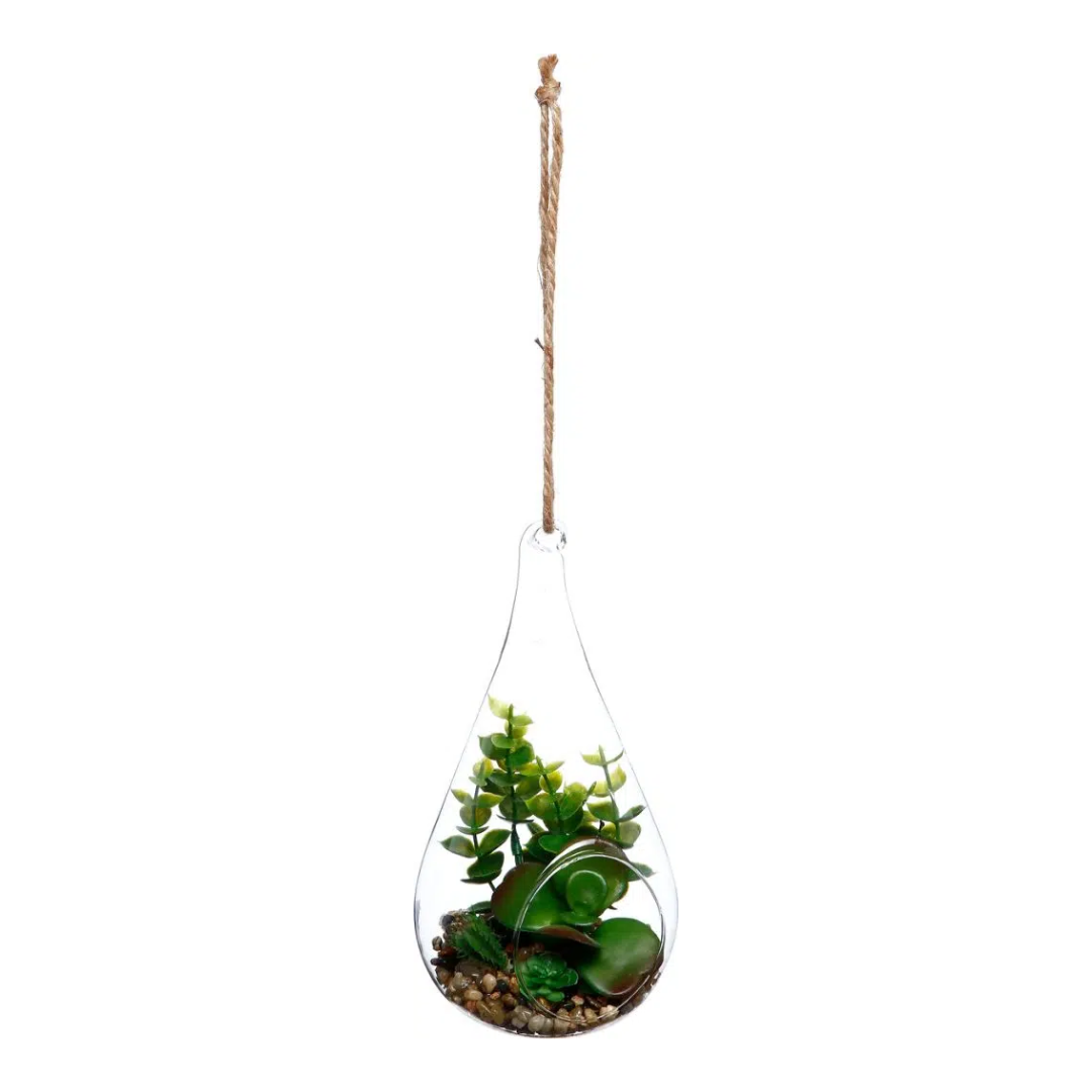 An artificial plant in a glass drop is ideal for bringing a touch of nature and freshness into your interior. It can be easily hung on a small hook or nail on the wall. This green artificial plant in a mini terrarium does not require any special maintenance. You can wipe the dust from the 19.5 cm high glass cap with a soft cloth, preferably soaked in a little water and dishwashing detergent. This item is also a great gift for loved ones.