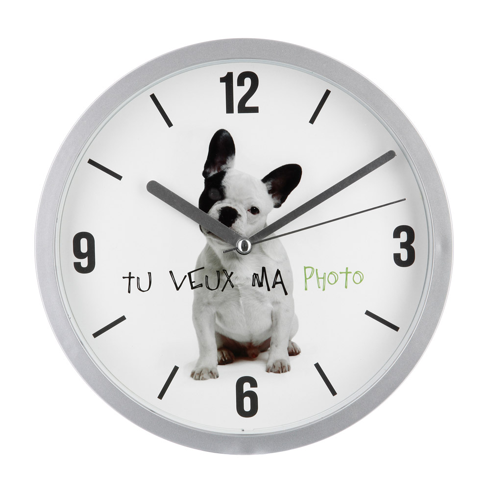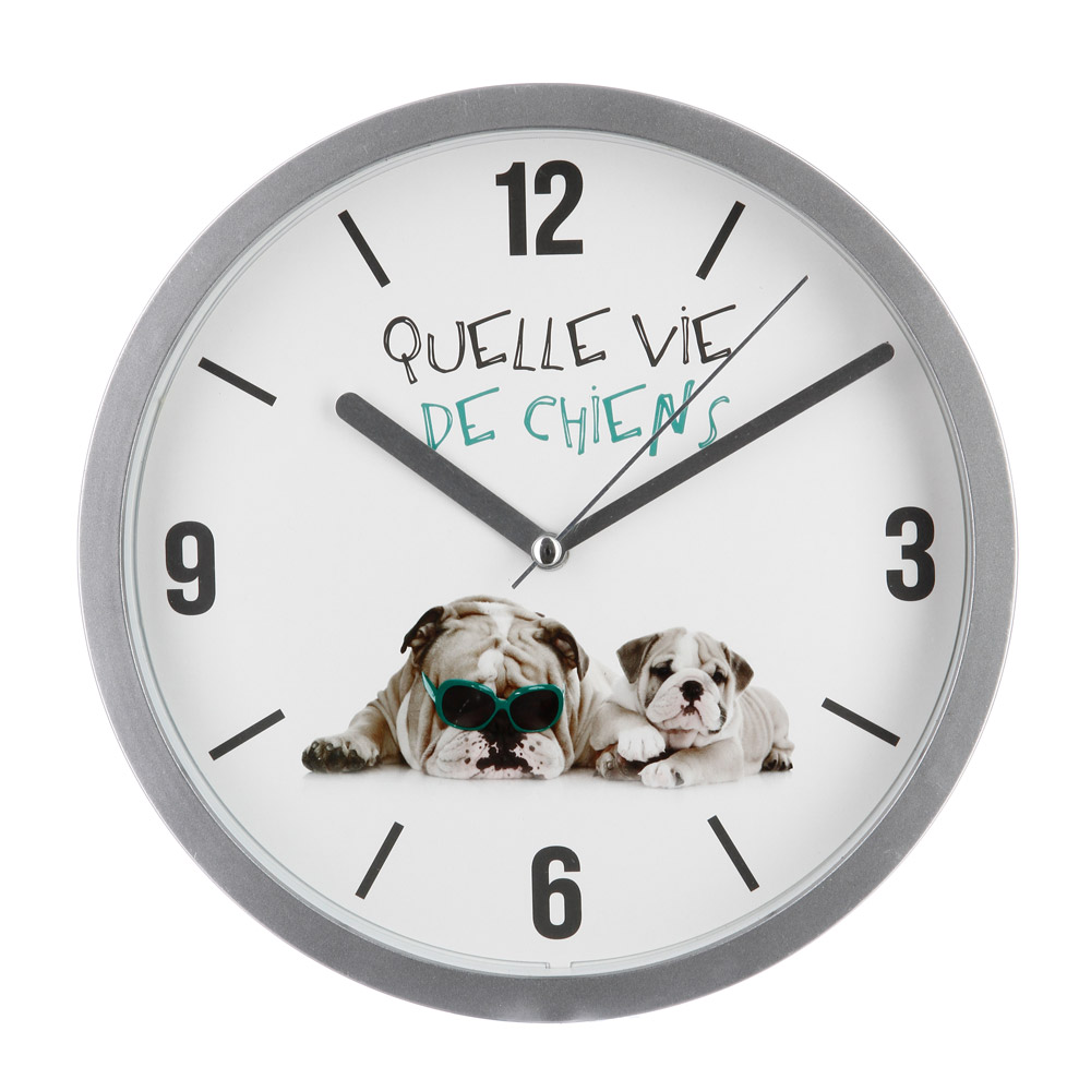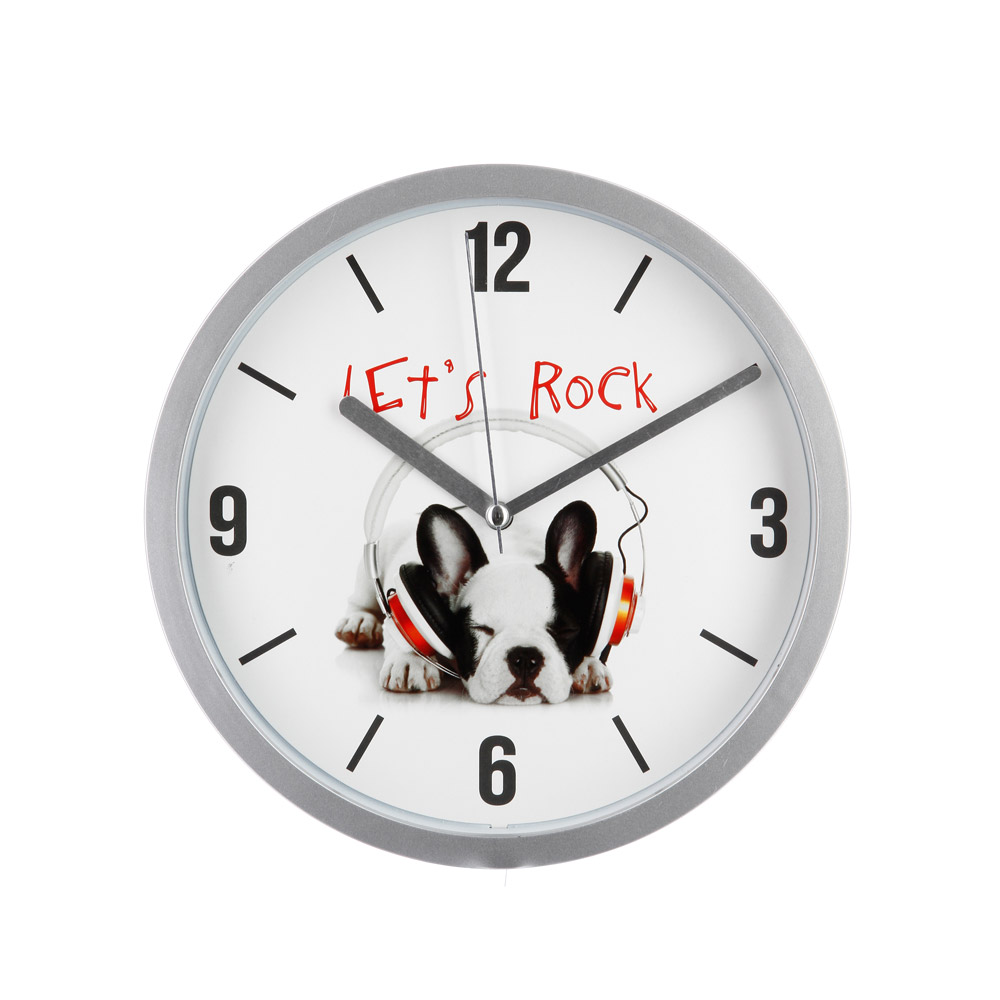 Beautify your decor with a reliable wall clock with a dog motif. Its striking presence commands attention and admiration, serving as a stunning eye-catching focal point. The watch is plastic, and its diameter is 22.3 cm.