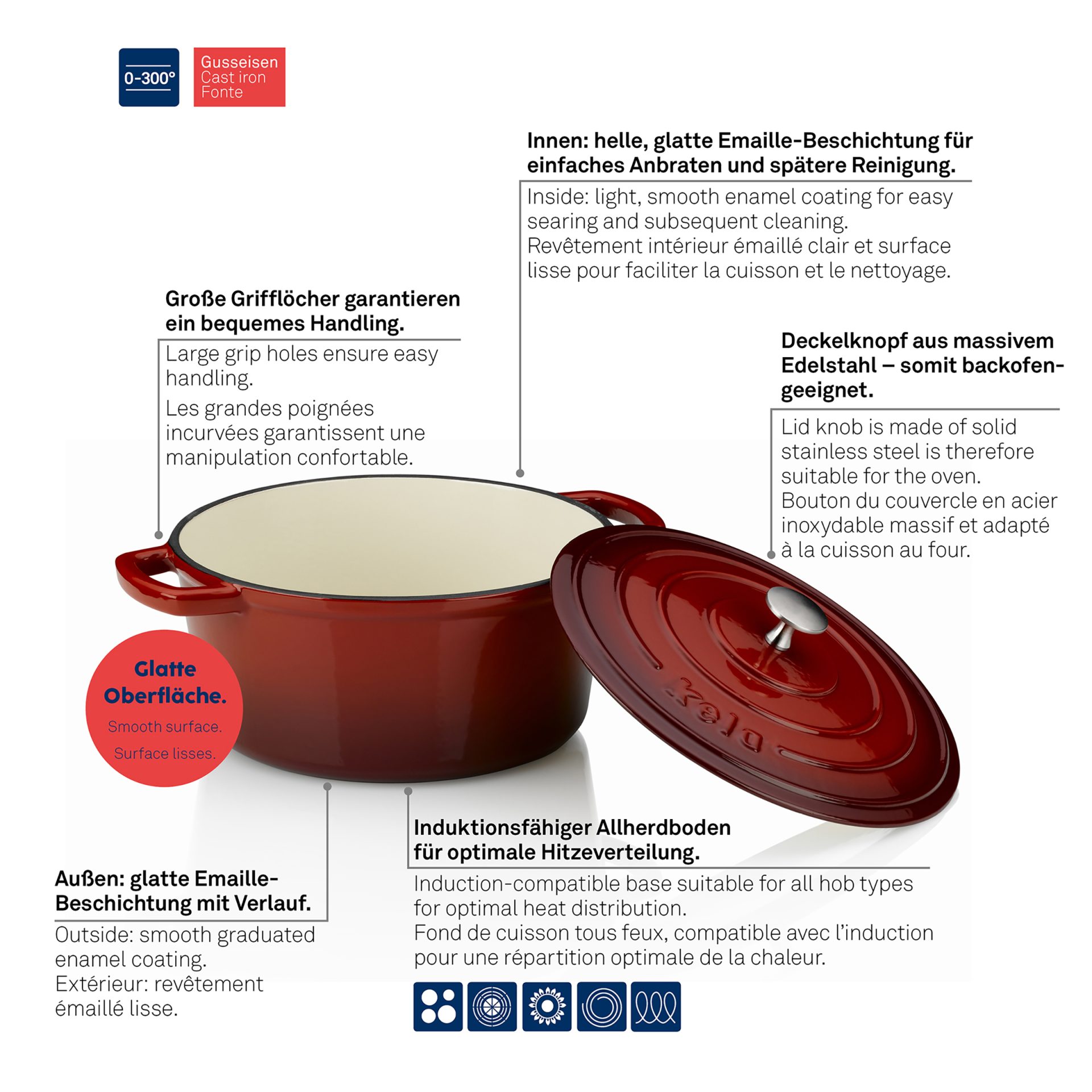 Calido cast iron round roasting pan in vibrant red color is the perfect addition to any kitchen. With a volume of 4.6 liters and a diameter of 26 cm, this roaster is ideal for preparing various dishes, from roasted meat specialties to delicious vegetable stews. The enamel coating not only contributes to the aesthetic appearance, but also ensures durability and easy cleaning. This roaster retains heat very well, and the interior heats up evenly, which achieves optimal cooking of all ingredients. It is suitable for all types of stoves, including induction, making it a versatile tool for your kitchen. In addition, it can be used in the oven up to a high of 300°C, allowing you to experiment with different preparation techniques.