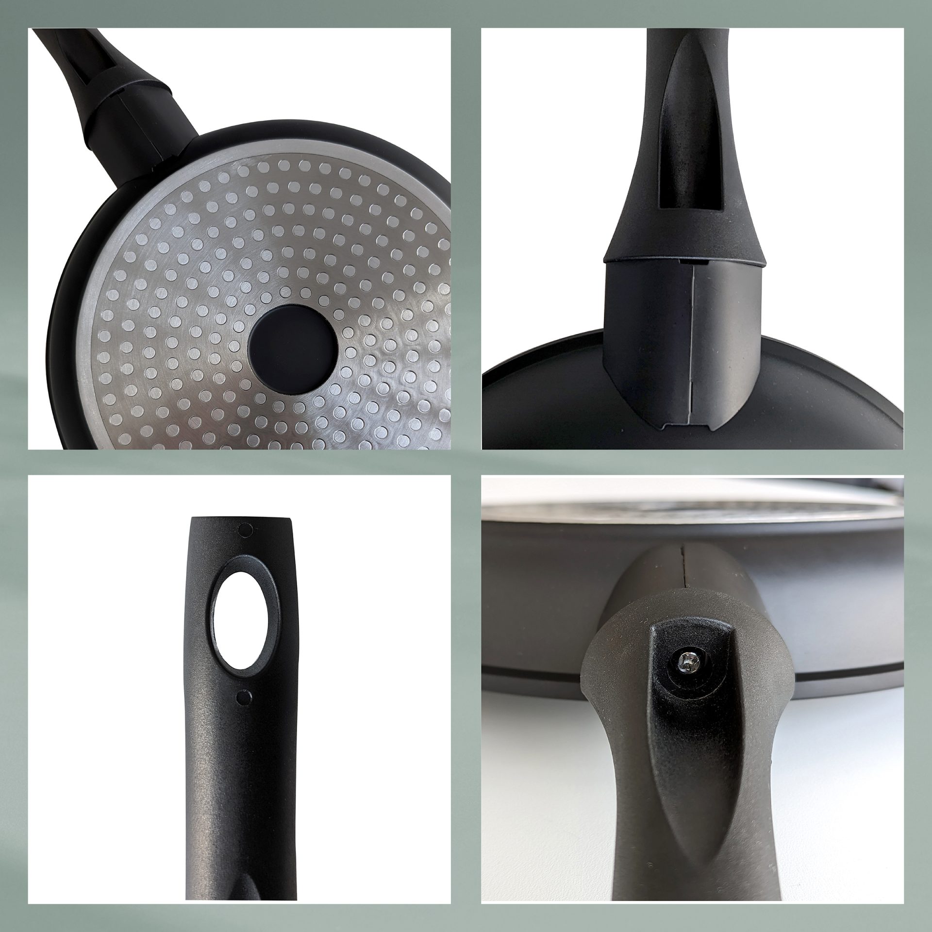 The Atura pan with a diameter of 24 cm and a height of 4.5 cm, made of high-quality cast aluminum in an elegant black color, is the perfect addition to your kitchen. Its durable construction allows for even heating and heat distribution, ensuring that dishes are cooked properly and with equal heat throughout the entire surface. Suitable for all types of stoves, including induction, this pan offers maximum flexibility in preparing different meals. Its surface is resistant to high temperatures, which makes it a reliable tool for everyday use. With its practical design and resistant material, this pan allows for easy maintenance and long-term use, making it an ideal choice for anyone who appreciates quality and functionality in the kitchen.