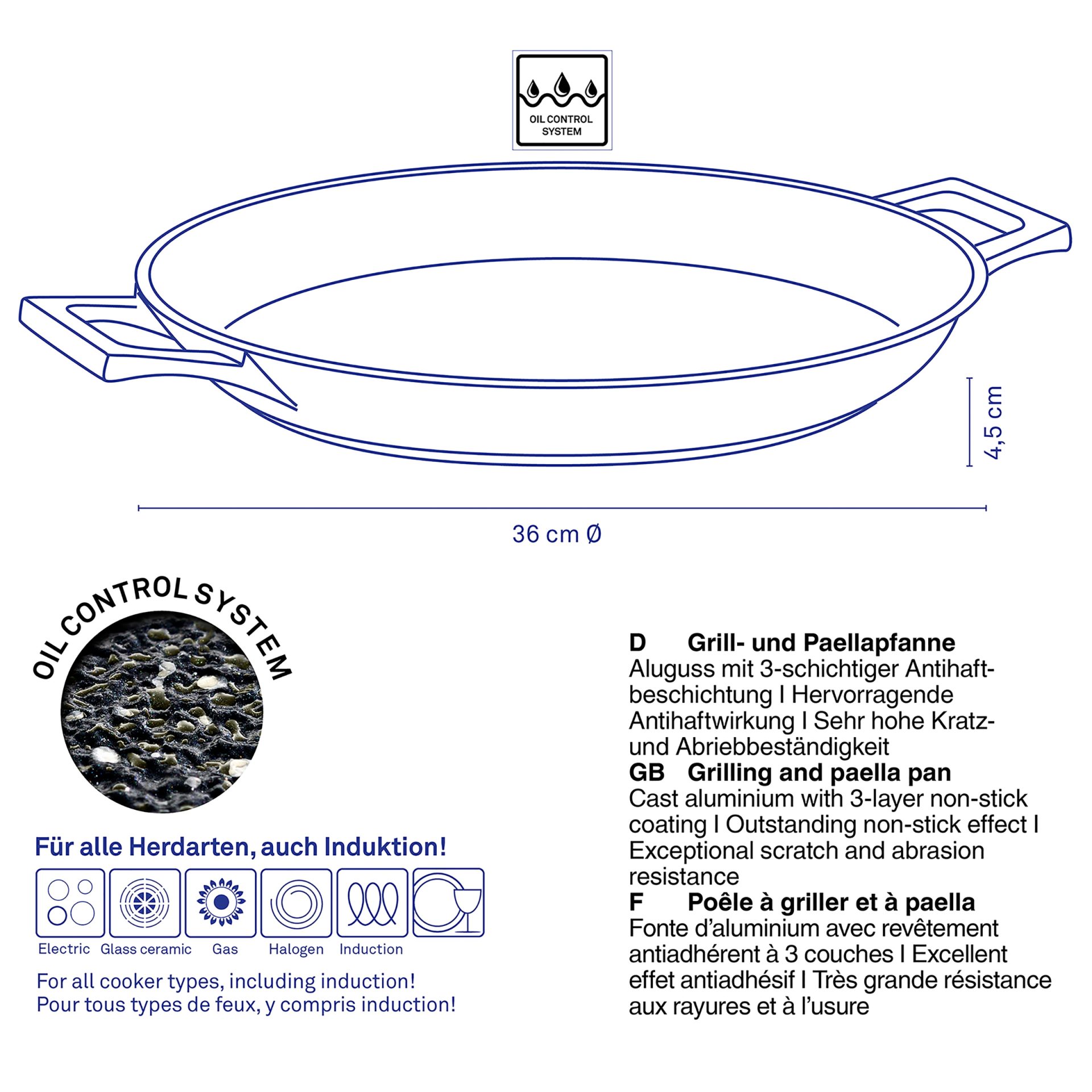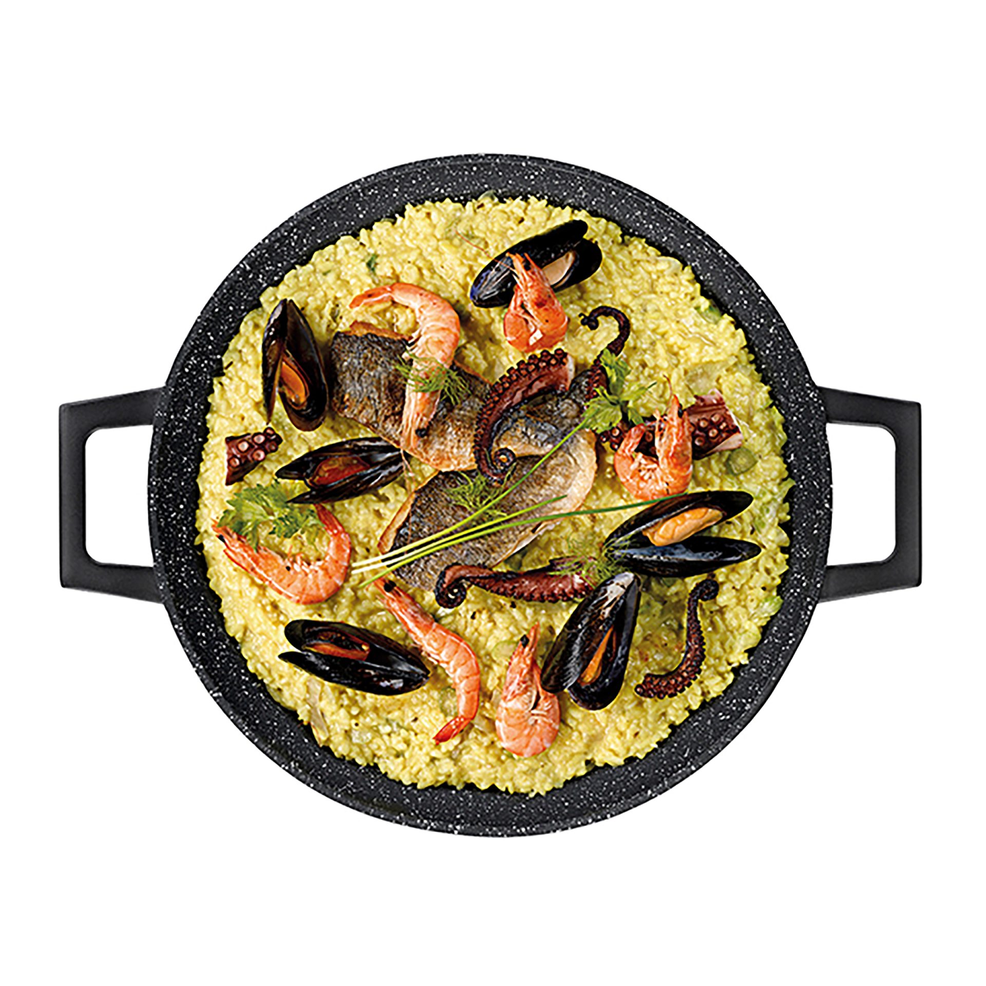 Take advantage of all the culinary possibilities with this outstanding Stella Nova grill and paella pan, which is perfect for preparing delicious meals in the comfort of your home. With dimensions of 36×4.5 cm, this cast aluminum pan offers enough space to prepare a variety of dishes, from juicy grilled meats to colorful vegetables and classic paella. The innovative Oil-Control-System technology ensures an even distribution of oil and fat, allowing you to prepare delicious meals with less fat. This special surface structure improves frying, making dishes more juicy and full of flavor, while at the same time helping to maintain healthier eating habits. With a non-stick coating, the pan allows easy turning and serving of food, and cleaning becomes a quick and carefree task. This pan is also extremely versatile, suitable for use on all types of hobs, including induction, making it a perfect fit in any kitchen space. Heat-resistant up to 260° C, the pan is designed for high temperatures, which makes it ideal for grilling and baking. The black color and elegant design add a touch of style to your kitchenware, while the outstanding functionality will impress all cooking lovers.