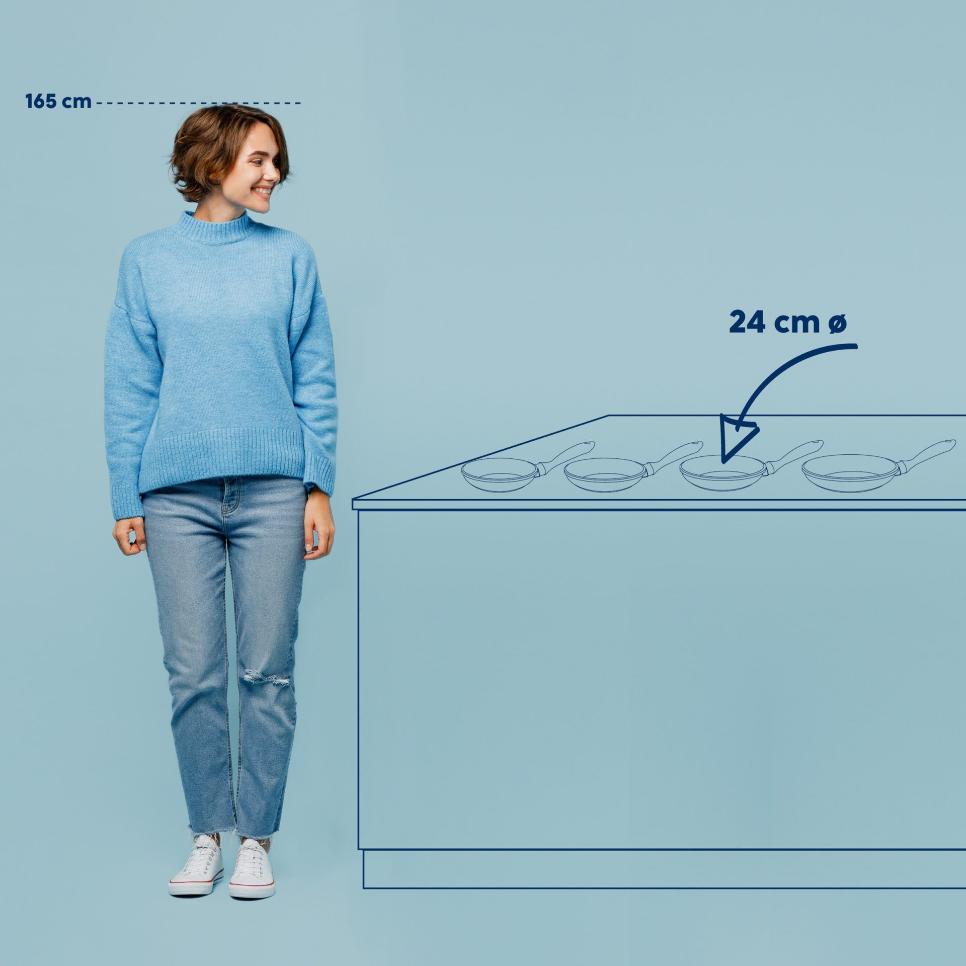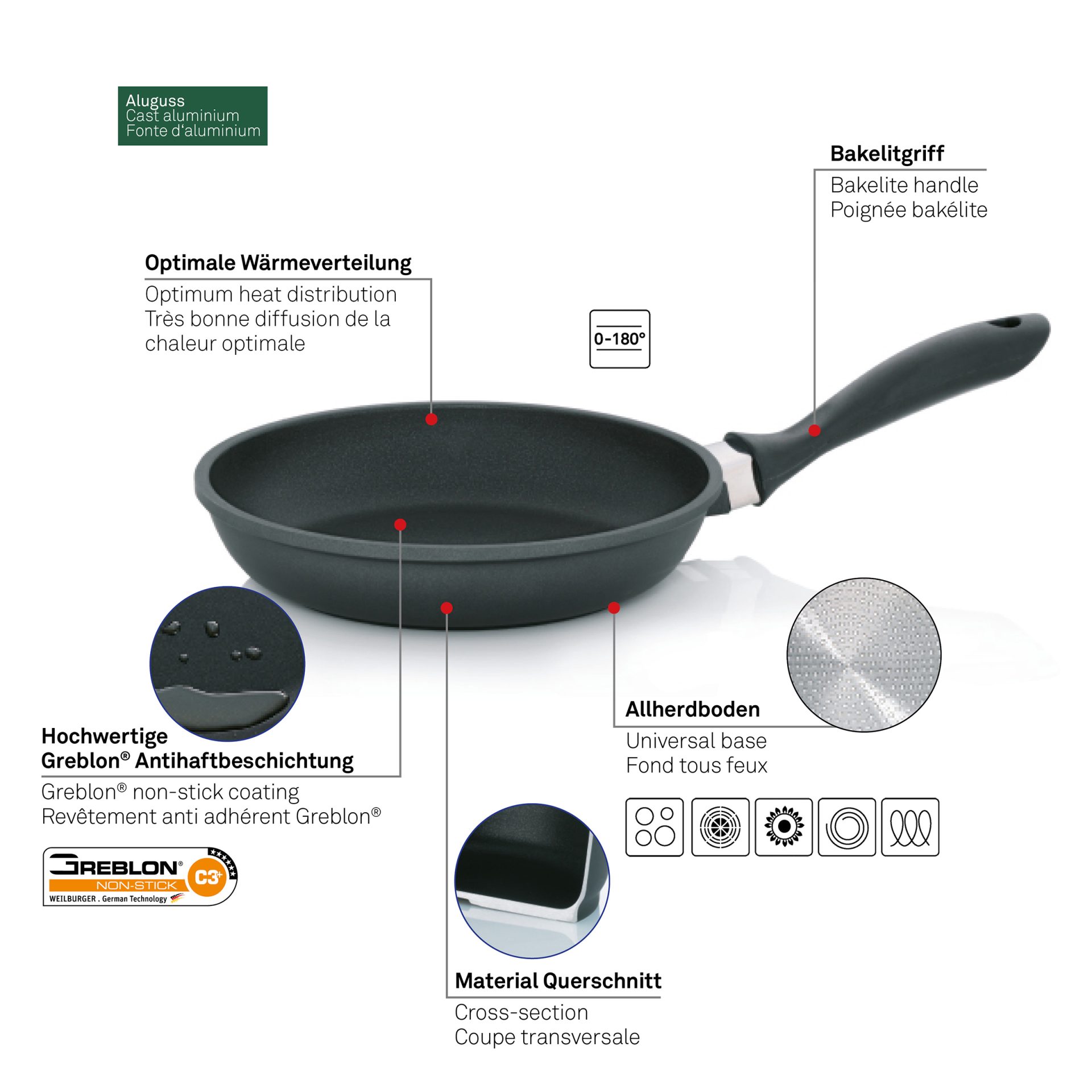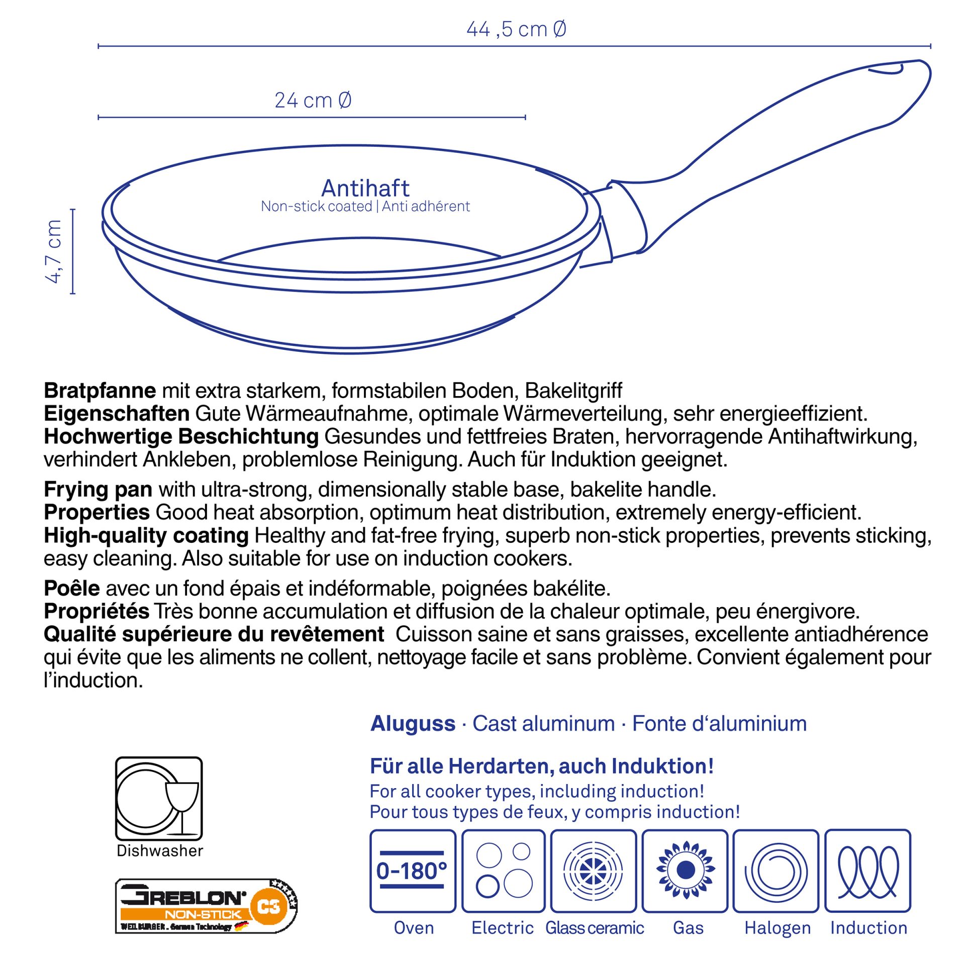 The black Kerros pan, made of high-quality cast aluminum, is the perfect addition to any kitchen that requires functionality and durability. With a diameter of 24 cm and a height of 4.5 cm, this pan is ideal for preparing a variety of dishes, from frying vegetables to roasting meat, allowing for even cooking without retaining heat in certain areas. What sets this pan apart is the advanced non-stick coating, additionally reinforced with fine ceramic particles, which allows not only easy sliding of food, but also high resistance to scratches and impacts. Thanks to this technology, food will not stick, making it easier to cook with less oil or fat, making your meals healthier and easier to prepare. The non-stick coating ensures long-term durability and enables effortless cleaning of the pan, and does not lose its qualities over time. The specially designed stand, 5 mm thick, further improves the energy-efficient way of preparing food. It optimally distributes heat over the entire surface of the pan, reducing energy consumption, and at the same time retains heat for a longer time, enabling consistent cooking results. The pan is extremely heat resistant up to 180°C, making it suitable for all types of stoves, including gas, electric, ceramic and induction plates, providing maximum flexibility in the kitchen. To keep the pan in the best condition, it is recommended to clean it under warm running water without using aggressive cleaning agents, because in the long term salt and agents can damage the surface. It is ideal to use a soft cloth when washing, preferably without detergent, which ensures the preservation of its non-sticky layer. After cleaning, dry the pan thoroughly with a kitchen towel to extend its life. With its combination of high functionality, resistance and easy maintenance, this pan represents the perfect combination of quality and style, allowing you to prepare delicious dishes with ease and pleasure. Its black color and modern design will further enhance any kitchen, while its durability guarantees long-term use.