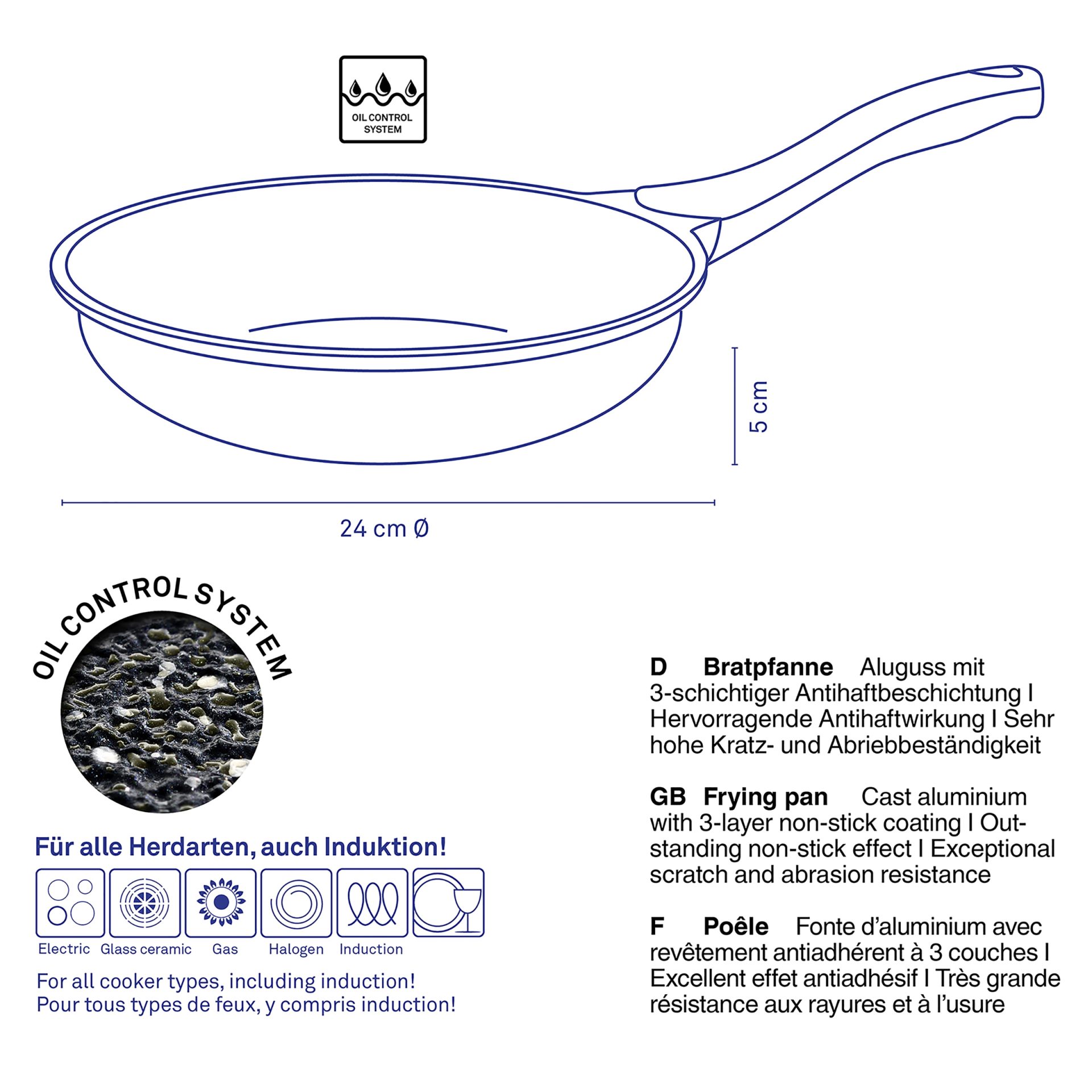 The Stella Nova pan made of cast aluminum brings a revolution to your kitchen and is the ideal partner for all your culinary creations. With dimensions of 24×5 cm, the pan is perfect for preparing a variety of dishes, from delicious eggs for breakfast to juicy vegetables and meat delicacies. The innovative Oil-Control-System technology ensures an even distribution of oil and fat, allowing you to enjoy healthier meals without compromising on taste. This special surface treatment system not only contributes to optimal frying, but also reduces the need to add large amounts of fat, making your dish tastier and more nutritious. With the non-stick coating, preparing and serving food becomes easier than ever. Regardless of whether you are preparing quick meals or gourmet delicacies, this pan enables easy cleaning and maintenance, saving you time and energy. In addition, this pan is suitable for all types of stoves, including induction plates, thus fitting into any kitchen space. The black color and modern design contribute to an elegant appearance, while at the same time guaranteeing high functionality.