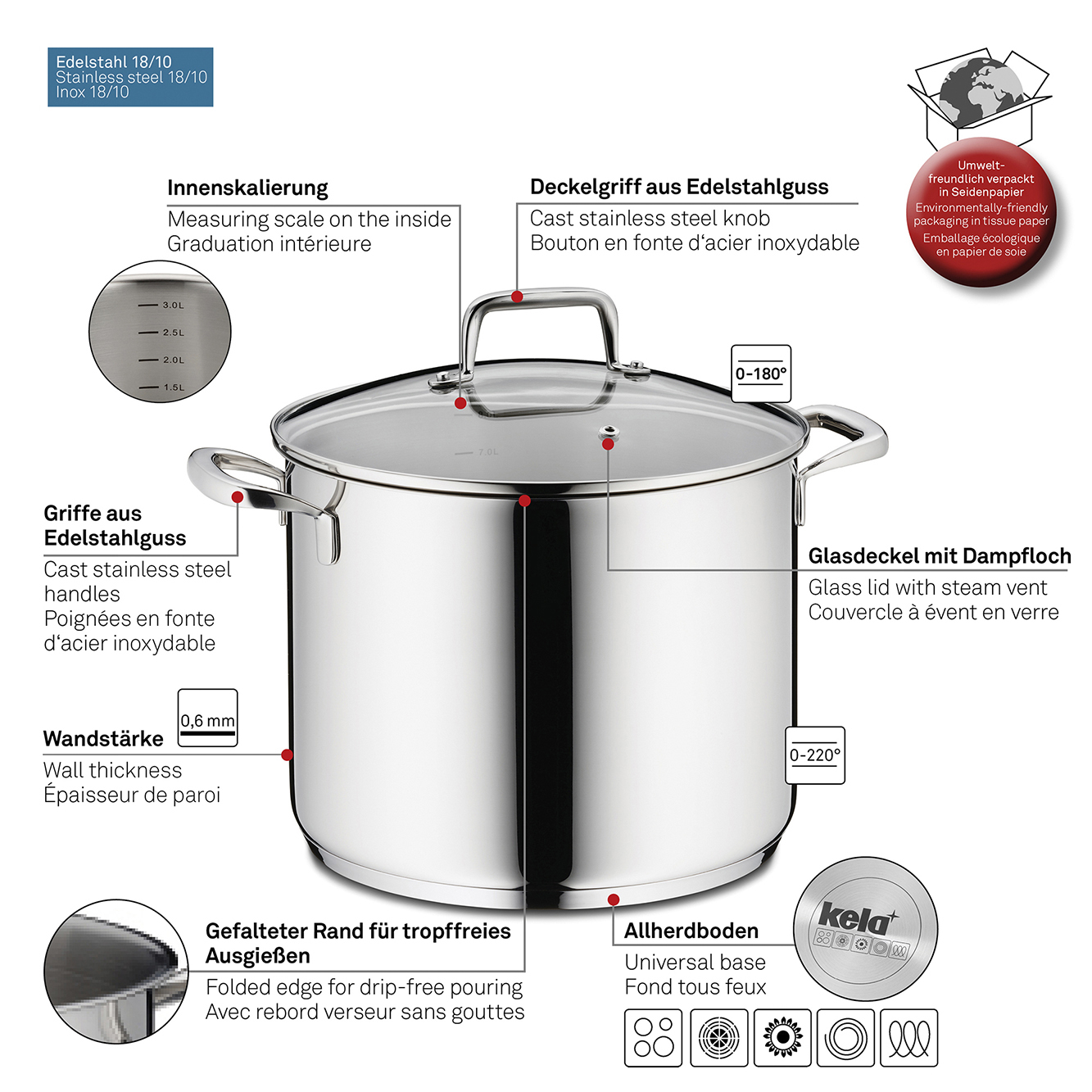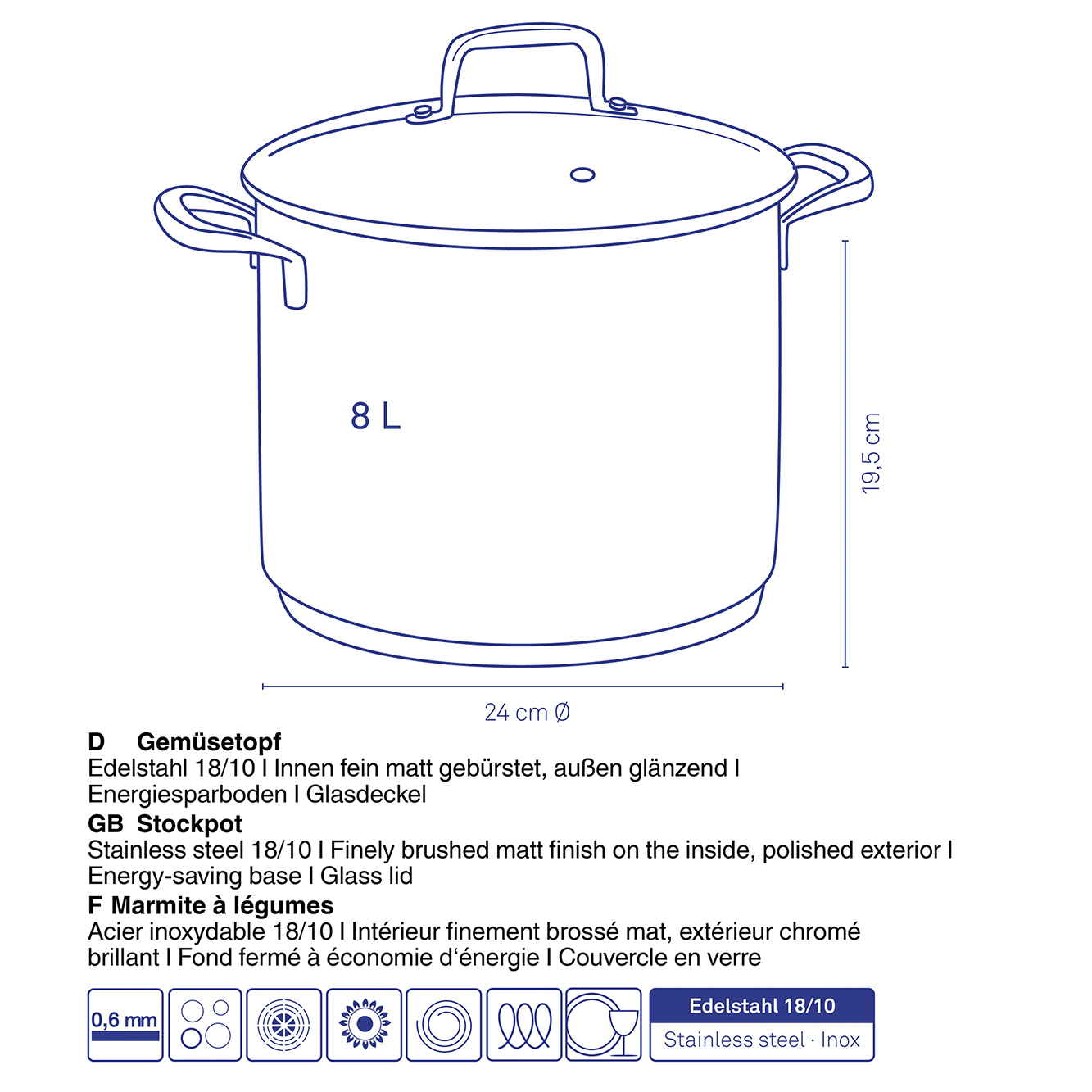The Flavoria 8 liter pot is made of high-quality 18/10 stainless steel, which gives it exceptional durability and corrosion resistance, and the elegant silver finish fits perfectly into any kitchen. This pot combines superior performance with modern design, ensuring you a long-lasting product that will satisfy all your culinary needs. Its glass lid is equipped with a steam valve, which allows for even temperature regulation, preventing the accumulation of excess steam and thus enabling the achievement of ideal conditions for cooking your favorite dishes. The inside of the pot contains a practical measuring scale, which allows you to easily and accurately read the current volume of liquid, which makes food preparation even easier. The Flavoria pot is compatible with all types of stoves, including induction plates, and its high heat resistance allows it to be used at temperatures up to 220°C. When using a pot with a lid, you can safely heat it up to 180°C, giving you maximum flexibility in the kitchen. With this pot, you will not only prepare dishes with a superior taste, but you will also save time thanks to its simplicity and efficiency.