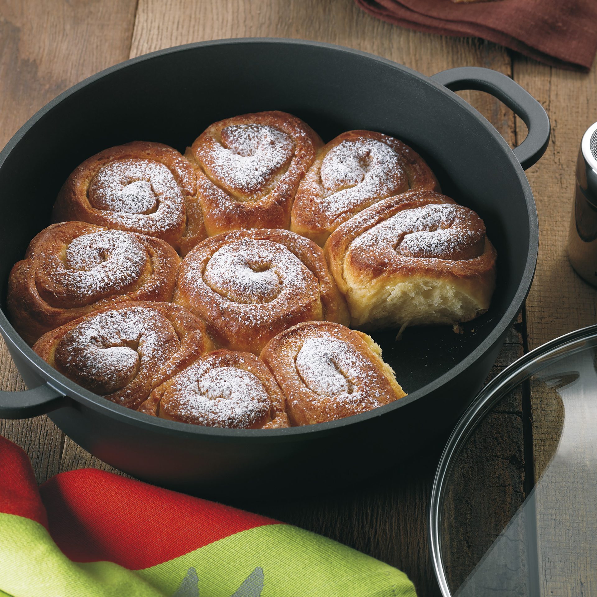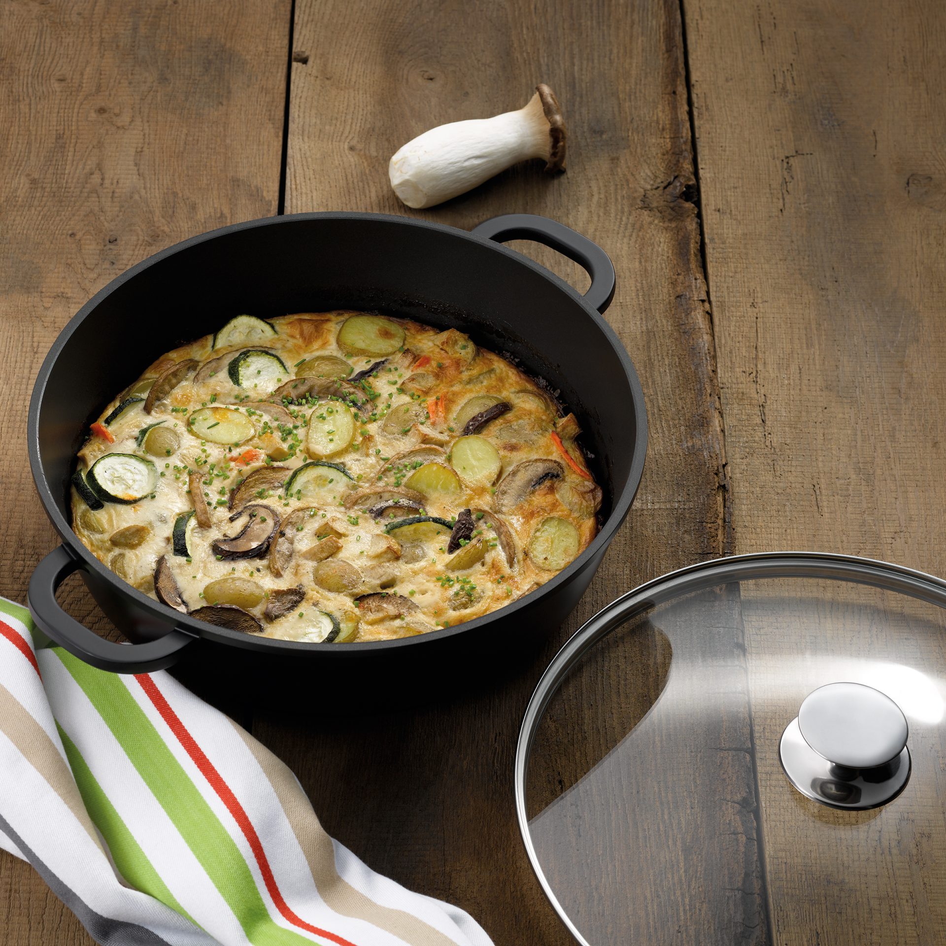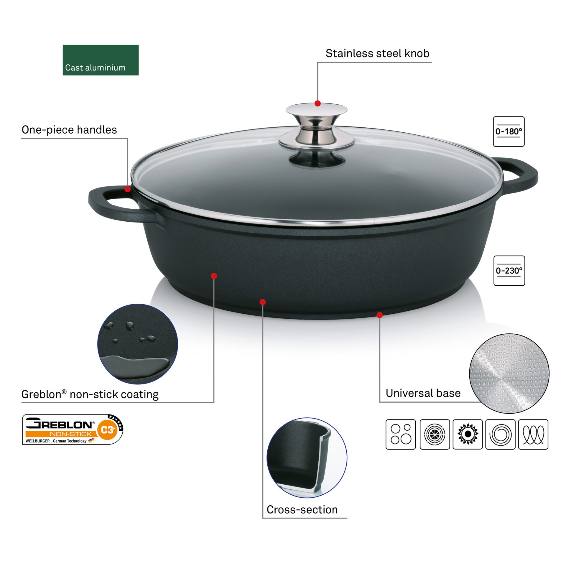 The Kerros pot with a lid, black, made of cast aluminum, holds 5 liters and is a perfect combination of aesthetics and functionality, ideal for everyday cooking. The high-quality non-stick coating enables easy food release and easy cleaning, while the ceramic particles additionally strengthen the surface, making the pot durable and scratch-resistant. With a diameter of 32 cm and a height of 9 cm, this pot is perfectly suited for preparing a variety of dishes, from soups to stews, and is suitable for all types of stoves, including induction. In addition, it can be used in the oven up to 180°C with the lid and up to 220°C without it, making it an extremely versatile addition to any kitchen. The fire-resistant glass lid allows you to monitor the cooking process without opening it, preserving moisture and flavors inside the pot. The stainless steel handle not only adds a sophisticated look, but also ensures safe and easy handling.
