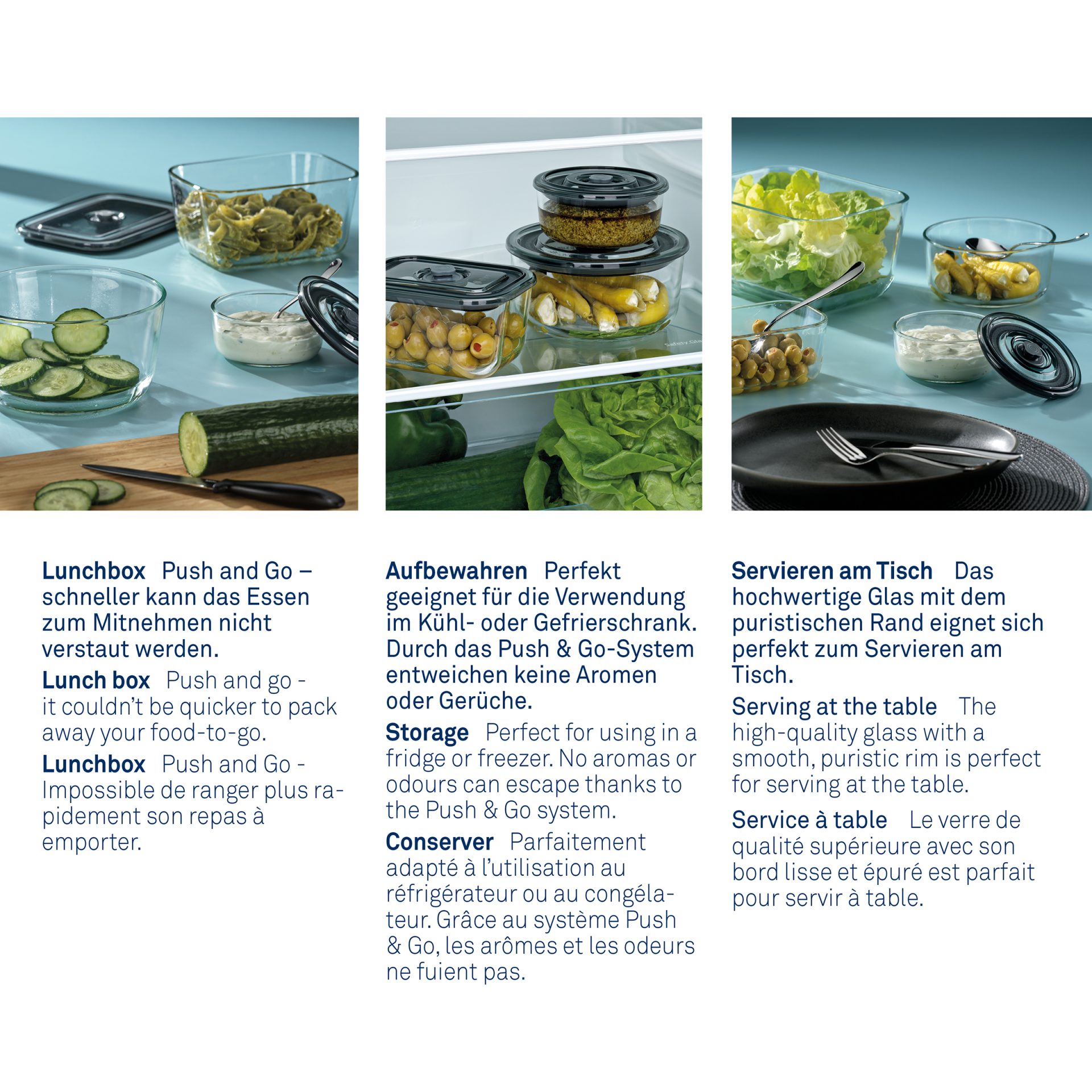 The Aurelia fireproof container with a lid is an ideal addition to any kitchen, providing you with practicality and versatility when preparing and serving food. This glass container with a volume of 0.4 L and dimensions of 14x10x6.5 cm can not only withstand high temperatures up to 300°C, but is also safe for use in the microwave oven, making it the perfect choice for quickly heating or cooking food. The plastic lid is equipped with an innovative Push & Go system that enables easy creation of a vacuum with light pressure. This feature ensures that the lid presses tightly against the container, thus preserving the freshness and aroma of the food. It is ideal for storing various foods, from vegetables and fruits to soups and sauces, as well as for preparing meals in advance. The glass construction not only allows easy monitoring of the cooking process, but also ensures even heating of the food. Regardless of whether you are preparing a meal for the family or organizing a dinner with friends, a fireproof container with a lid will allow you to do everything easily and in style. Include this practical piece in your kitchen and enjoy the countless possibilities it offers!