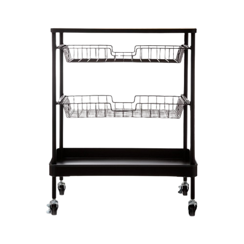 A black kitchen cart with a brown work surface will become your best friend in the kitchen. In addition to the work surface, the trolley is equipped with four wheels, two baskets and one shelf at the bottom of the trolley. Made of high-quality stainless steel. Dimensions: 60.5×40.5×79.5 cm.