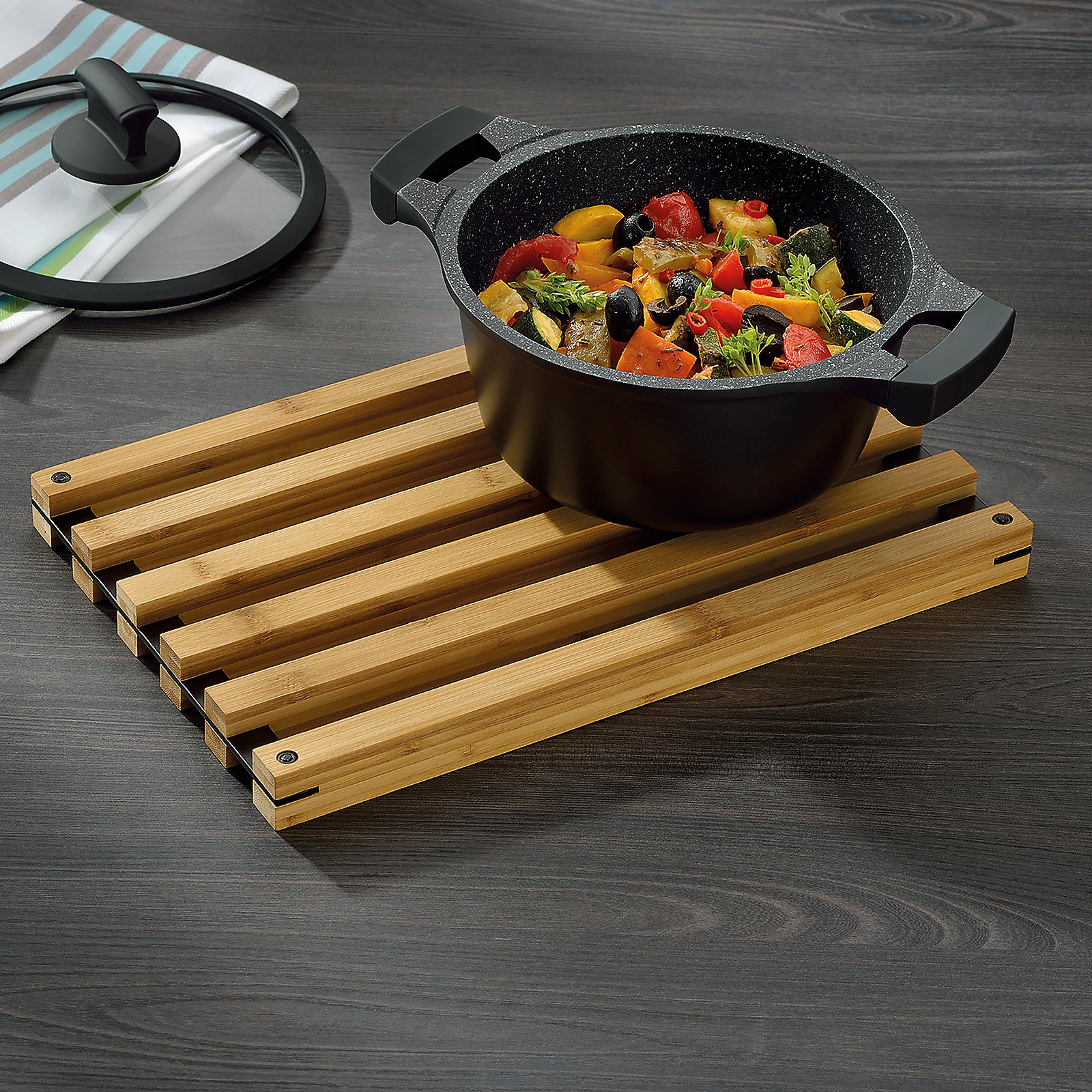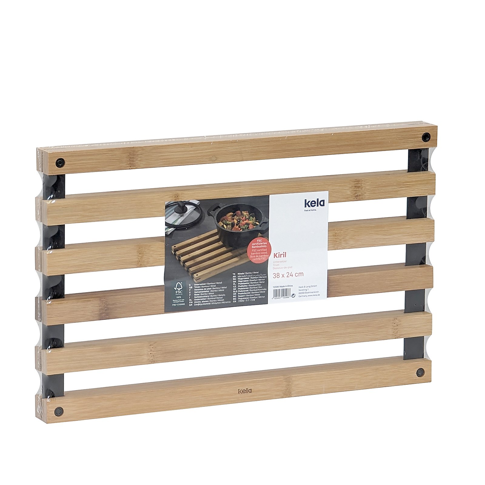 Podmetač za lonac Kiril od bambusa u kombinaciji crne i smeđe boje donosi stil i funkcionalnost u vašu kuhinju i blagovaonicu. Dimenzija 38x24x3 cm, ovaj podmetač savršeno je rješenje za zaštitu površina od vrućih lonaca, tava i jela, a njegov rešetkasti dizajn omogućuje optimalnu cirkulaciju zraka, čime se sprječava nakupljanje topline i vlage. Izrađen od visokokvalitetnog bambusa, podmetač je izdržljiv i ekološki prihvatljiv, što ga čini idealnim izborom za osviještene potrošače. Kombinacija crne i smeđe boje dodaje moderan i sofisticiran izgled, čineći ga savršenim dodatkom za svaki interijer.