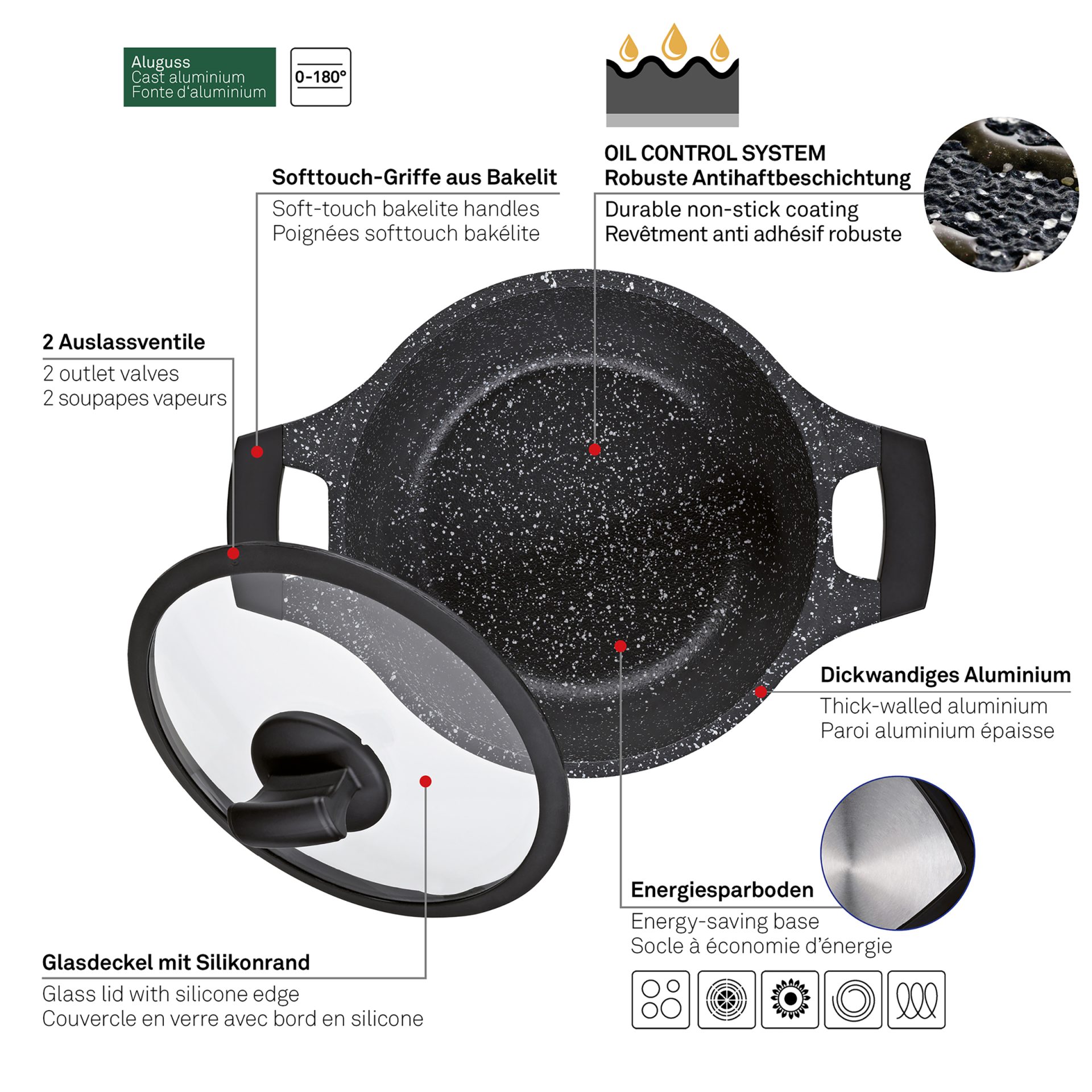 Lonac s poklopcem Stella Nova od lijevanog aluminija, zapremnine 2,2L i promjera 20 cm, predstavlja savršeni izbor za sve ljubitelje kuhanja koji žele unaprijediti svoje kulinarske vještine. Crne boje, ovaj lonac ne samo da će obogatiti vašu kuhinju estetski, već će pružiti i vrhunske performanse tijekom pripreme obroka. Jedna od ključnih značajki ovog lonca je poseban način obrade površine koji omogućava sustav kontrole ulja. Ovaj inovativni pristup omogućava vam da smanjite količinu ulja ili masti koju koristite, dok istovremeno uživate u ravnomjernoj raspodjeli. Robusni premaz protiv lijepljenja osigurava lako posluživanje, smanjuje vrijeme čišćenja i omogućava pripremu zdravijih obroka. Podnožje lonca opremljeno je bazom od nehrđajućeg čelika koja štedi energiju, čime se znatno smanjuje vrijeme zagrijavanja. Ova funkcionalnost čini lonac kompatibilnim sa svim vrstama štednjaka, uključujući indukcijske ploče, što ga čini izuzetno svestranom opcijom za svaku kuhinju. S ovim loncem, kuhanje postaje jednostavno i učinkovito. Bilo da pripremate ukusne varive, juhe ili povrće, njegov visoki kapacitet i robusna konstrukcija garantiraju savršene rezultate svaki put.