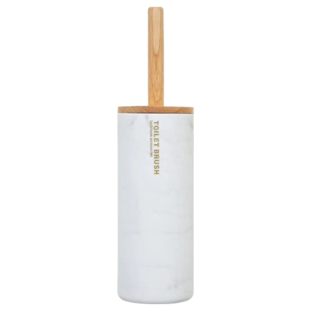 Wc četka s plastičnim bijelim plastičnim spremnikom i bambus drškom i poklopcem. Poklopac spriječava širenje neugodnih mirisa. Dimenzija:10,5×10,5×38 cm.